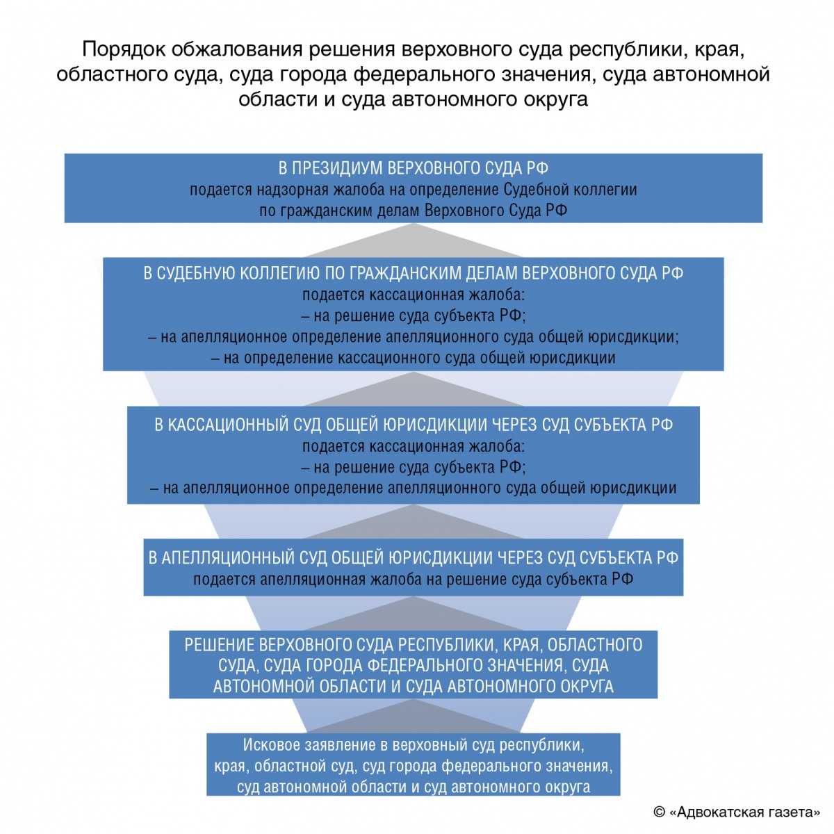 | Апелляционная инстанция | Кассационные суды, суды городов федерального значения, суды краевой юрисдикции, конституционные суды субъектов РФ |