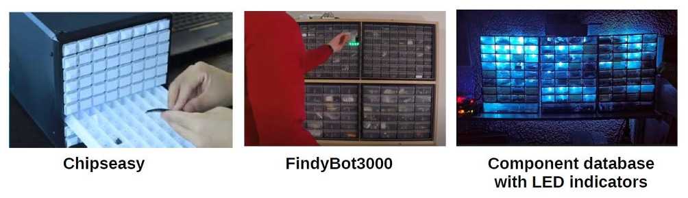 Chipseasy — проект с Kickstarter. Хранилище состоит из нескольких поддонов, каждый из которых разделён на прямоугольные ячейки. «Умное» хранение компонентов реализовано за счёт матричной адресации ячеек.Плюсы