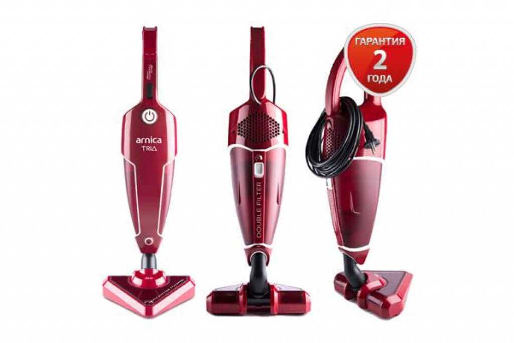 Вертикальные пылесосы имеют невысокую мощность и подходят для уборки напольных покрытий без ковров. Но есть исключения, например, Arnica Tria Pro с мощностью 1500 Вт может использоваться как основной пылесос и даже собирать грязь с ковров с коротким ворс. Он легкий, компактный, оснащен специальной треугольной насадкой, которая поворачивается на 360 градусов и убирает в самых труднодоступных местах. Кроме этого, в модели легко снимается верхняя ручка и она превращается в ручной пылесос, которым можно убирать отдельные элементы дома или салон автомобиля.