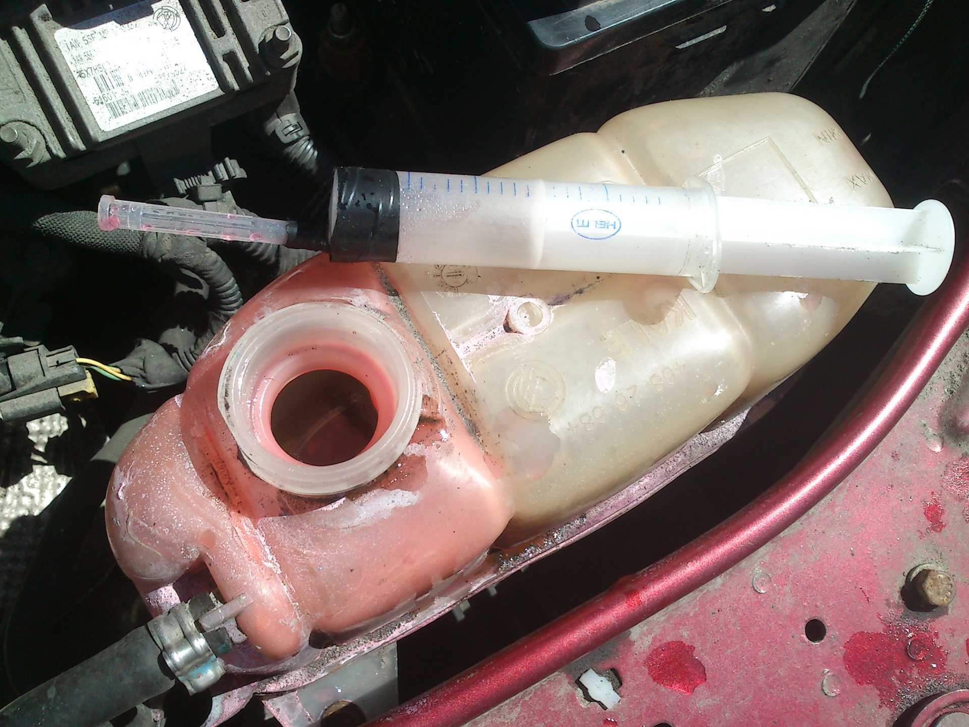 Прежде всего — не паниковать, но и оставлять все в таком виде тоже нельзя. Придется слить лишний антифриз, чтобы его объем опустился до рекомендованной отметки. Для этого вы вполне можете использовать медицинский шприц любого объема. Чтобы вам было удобнее, добавьте к шприцу трубку, которую можно будет опустить прямо в бачок.