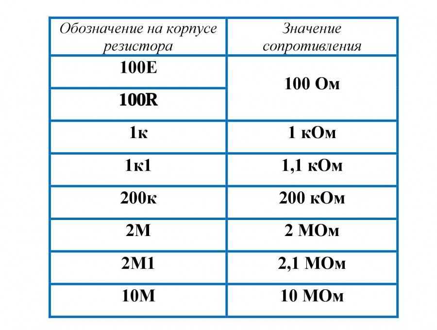 Элементы с проволочными выводами обозначаются нанесением на поверхность корпуса надписей. Числа обозначают номинал, а буквы соответствуют диапазону измерения. Буквы «E» и «R» для Ом, «K» обозначает килоом, «M» – мегом.