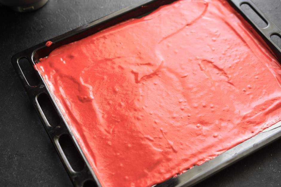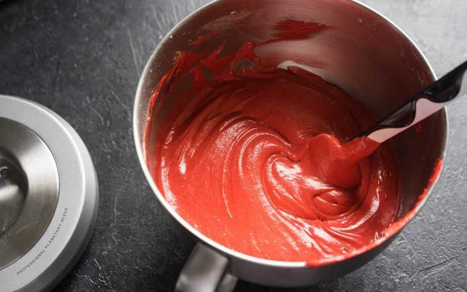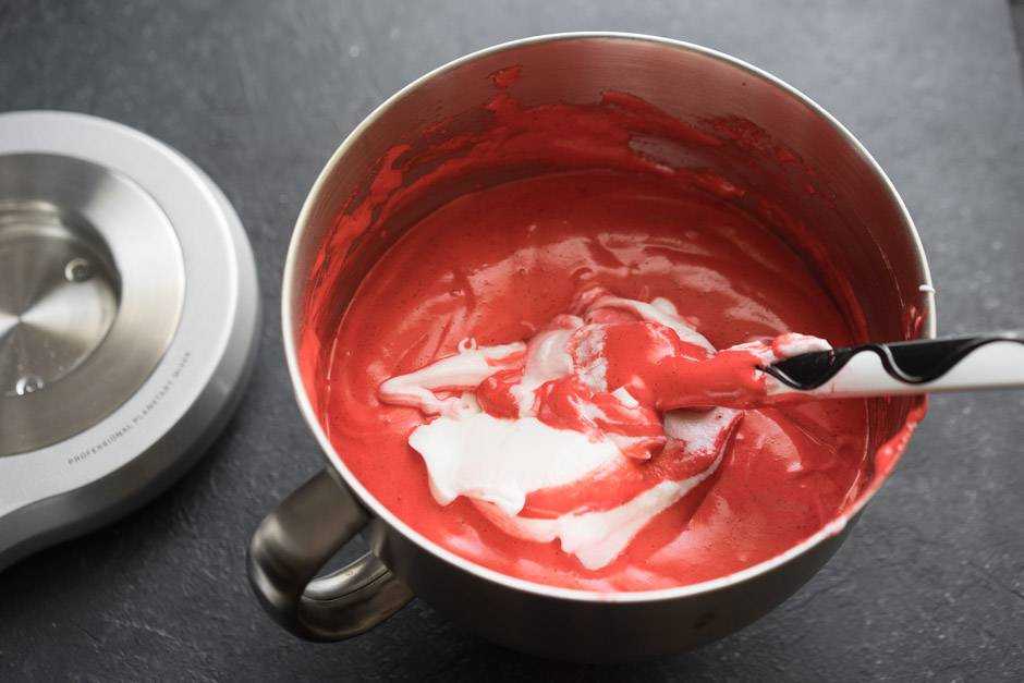 Если вы видите, что тесто получается недостаточно яркое, добавьте еще немного красного красителя и перемешайте на низкой скорости. - Отдельно взбиваем венчиком белки до образования пены (около 3 минут) и аккуратно вводим их в тесто, перемешивая силиконовой лопаткой снизу вверх.