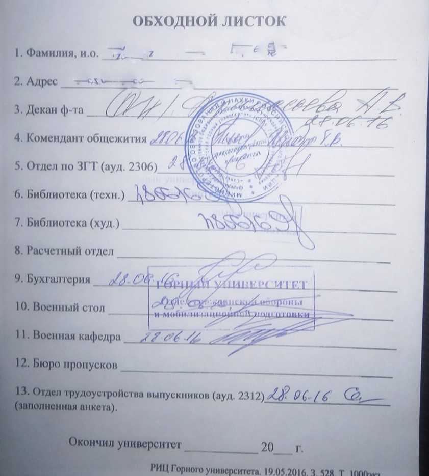 Затем нужно подписать обходной лист – подтверждение отсутствия долгов в институте. Обязательно нужно посетить кафедру, бухгалтерию института, библиотеку, ученый совет и общежитие (для учащихся других городов):