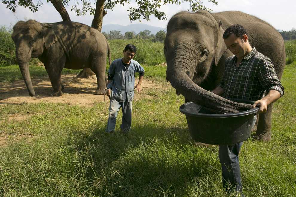 14. Основатель производства «Чёрного бивня» Блейк Динкин (Blake Dinkin) самолично кормит слонов. (Paula Bronstein/Getty Images)