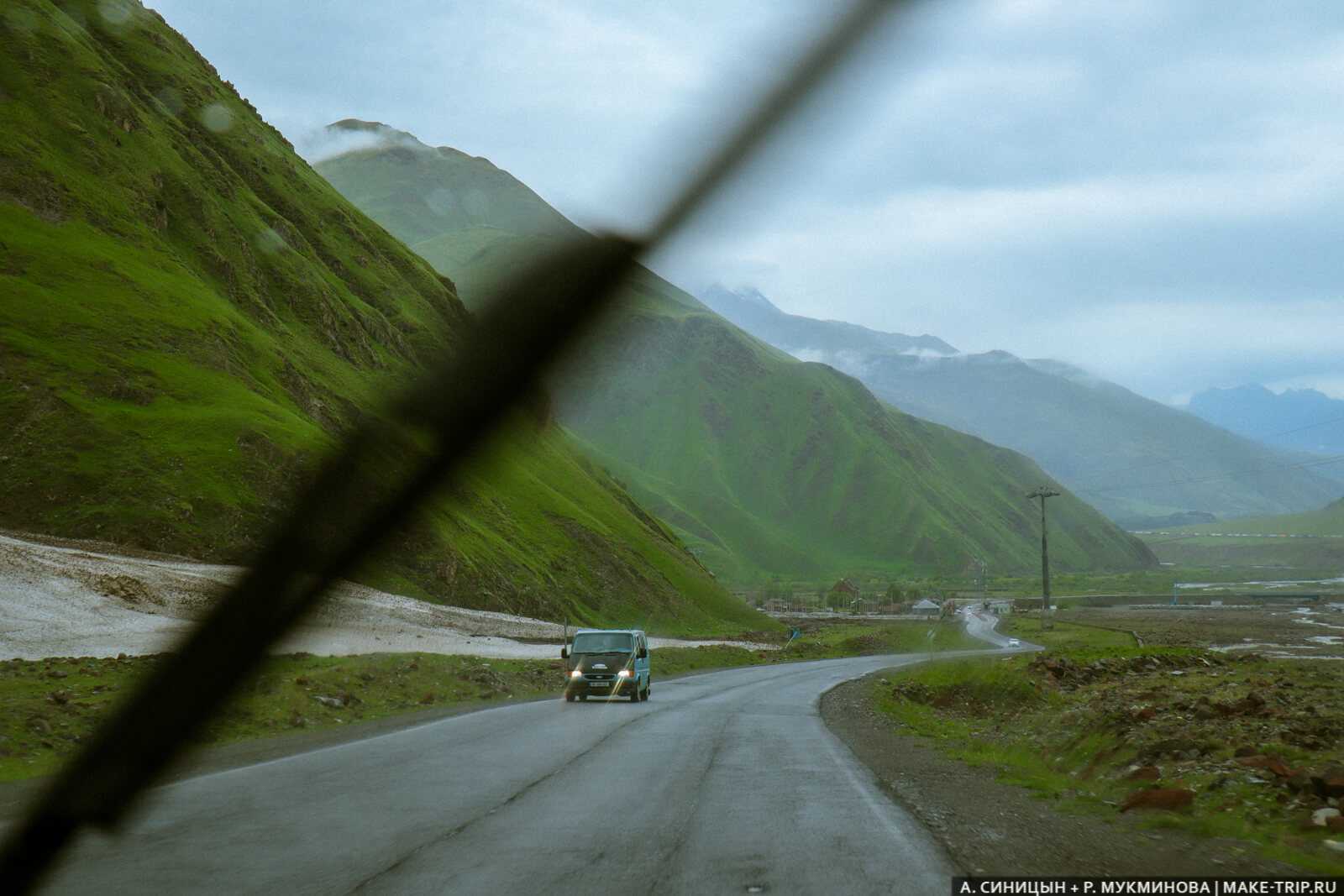 Грузия — страна небогатая, и это отражается на дорожном строительстве. Там есть лишь одна хорошая автомагистраль от Тбилиси до Кутаиси — 4–6 полос, разделительная полоса. А дальше везде двухполосная со встречкой. Ужасно. Ну как ужасно, нормальная дорога для России. В Грузии мы ехали по дороге, которая проложена по стенам и дну горного ущелья. Очень красиво, видны горы-тысячники и Казбек, но ехать там страшновато.