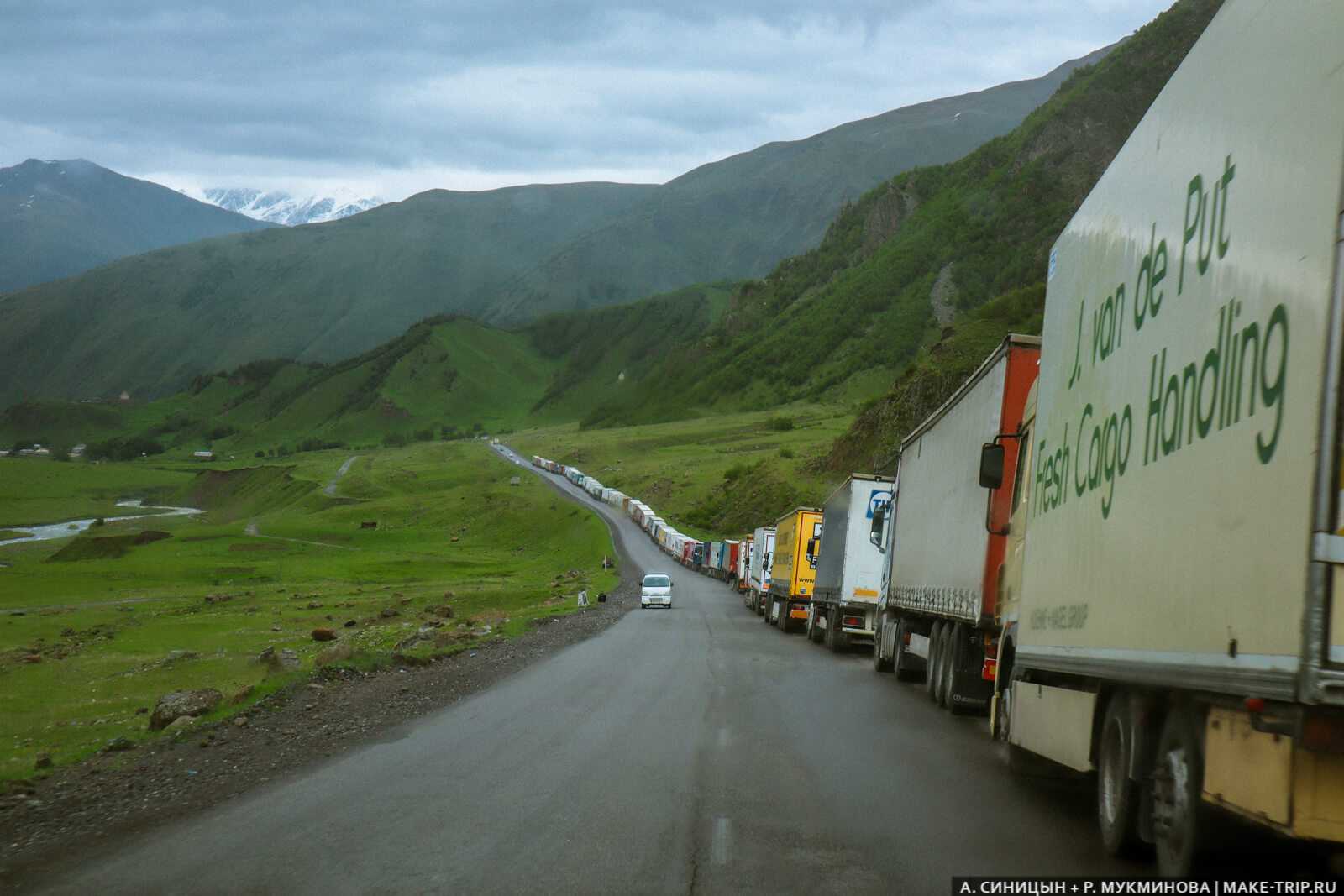 Вереница фур, ожидающих свою очередь перейти границу на КПП «Верхний Ларс». Летом выстраиваются очереди и из легковых машин с автобусами — учитывайте это.