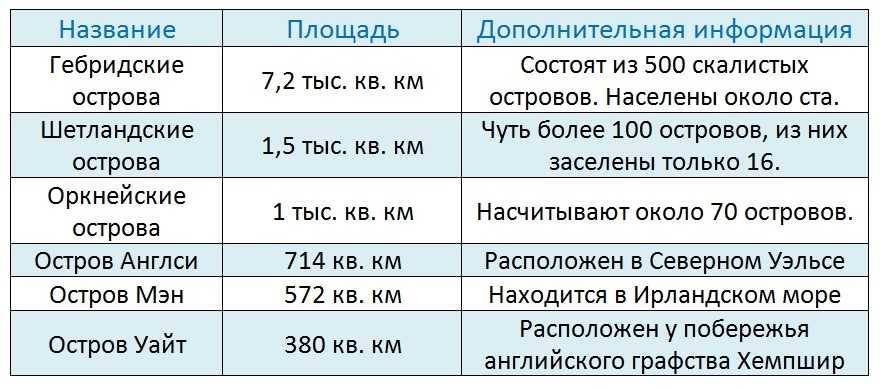 ЭГП страны главным образом характеризуется ее островным положением. Государство расположено на архипелаге Британские острова, из которых самым крупным островом является Великобритания. Площадь этого острова составляет 230 тысяч квадратных километров — это 94 % от всей территории страны. Также в ее состав входит северо-восточная часть острова Ирландия и ряд других островов. Наиболее крупные из них представлены в таблице.