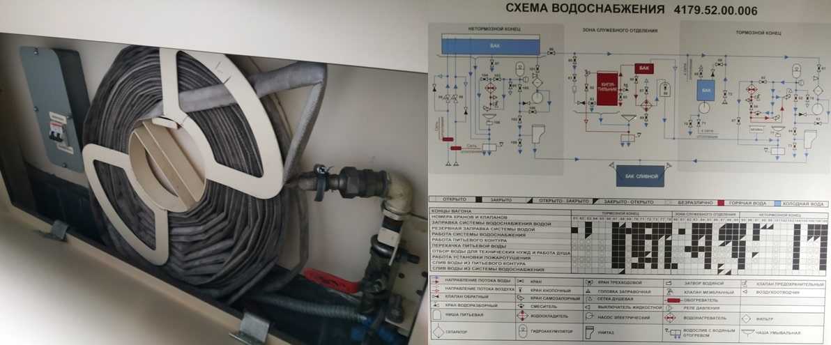 Установка водяного пожаротушения (имеются не во всех вагонах) – пожарный рукав, кран и кнопка запуска находятся в нише 2-го и 7-го купе. В случае отказа в работе электронасоса необходимо открыть кран, через который начнет поступать вода самотеком.