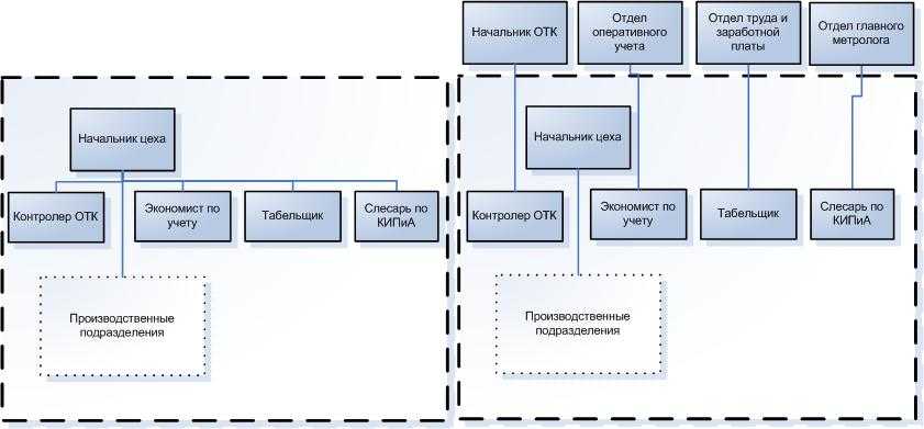 Объяснение, почему так нужно сделать – необходимо отказаться от того, чтобы возникали «маленькие царьки». Для примера – две возможные структуры производственного цеха, длинно-пунктирной линией обведены подразделения, основное рабочее место которых выгоднее установить «ближе к месту действия» (в цехах и на складах).