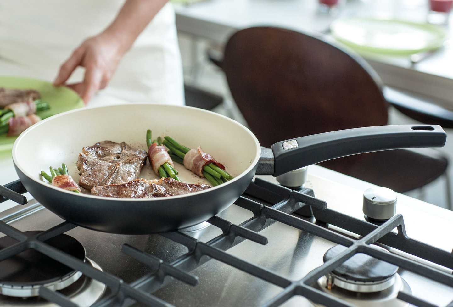 Ручка сковороды должна быть удобной и практичной, надежно лежать в руке, не скользить и не прогреваться. Хорошо, если ручка съемная, тогда сковорода займет меньше места на плите во время готовки и при хранении, а также подойдет для духовки.
