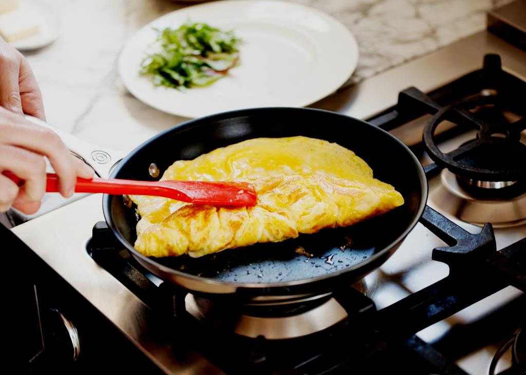 - Вылейте яичную смесь на сковороду и готовьте омлет на среднем огне до готовности.