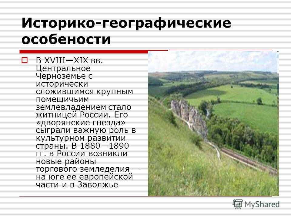 Историко-географические особености В XVIIIXIX вв. Центральное Черноземье с исторически сложившимся крупным помещичьим землевладением стало житницей России. Его «дворянские гнезда» сыграли важную роль в культурном развитии страны. В гг. в России возникли новые районы торгового земледелия на юге ее европейской части и в Заволжье