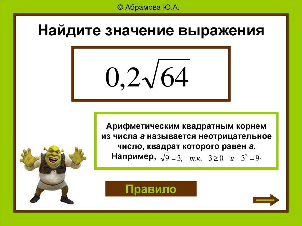 Если вы используется сайт, то в данном случае есть возможность использовать css и знак корня сделать более интересным(). Запись корня происходит абсолютно аналогично первому пункту — 1).знак,2).число,3).равно,4).результат.