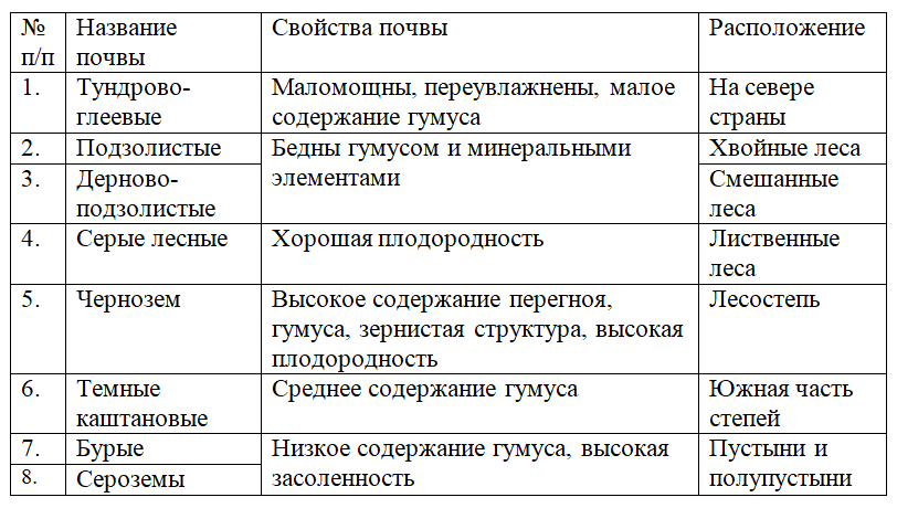 В таблице представлены природные зоны и типы почв, которые там расположены.