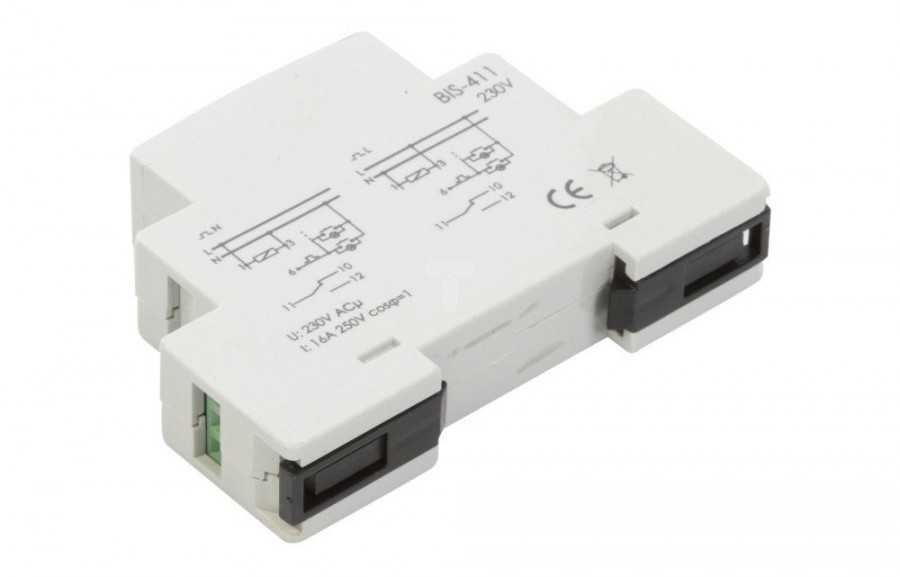 Импульсное реле бистобильного типа 411. Оно способно проводить до 12 В. Кнопки устройства параллельно соединяются между собой. При замыкании контактов в одном месте происходит разблокировка цепи в другой точке.