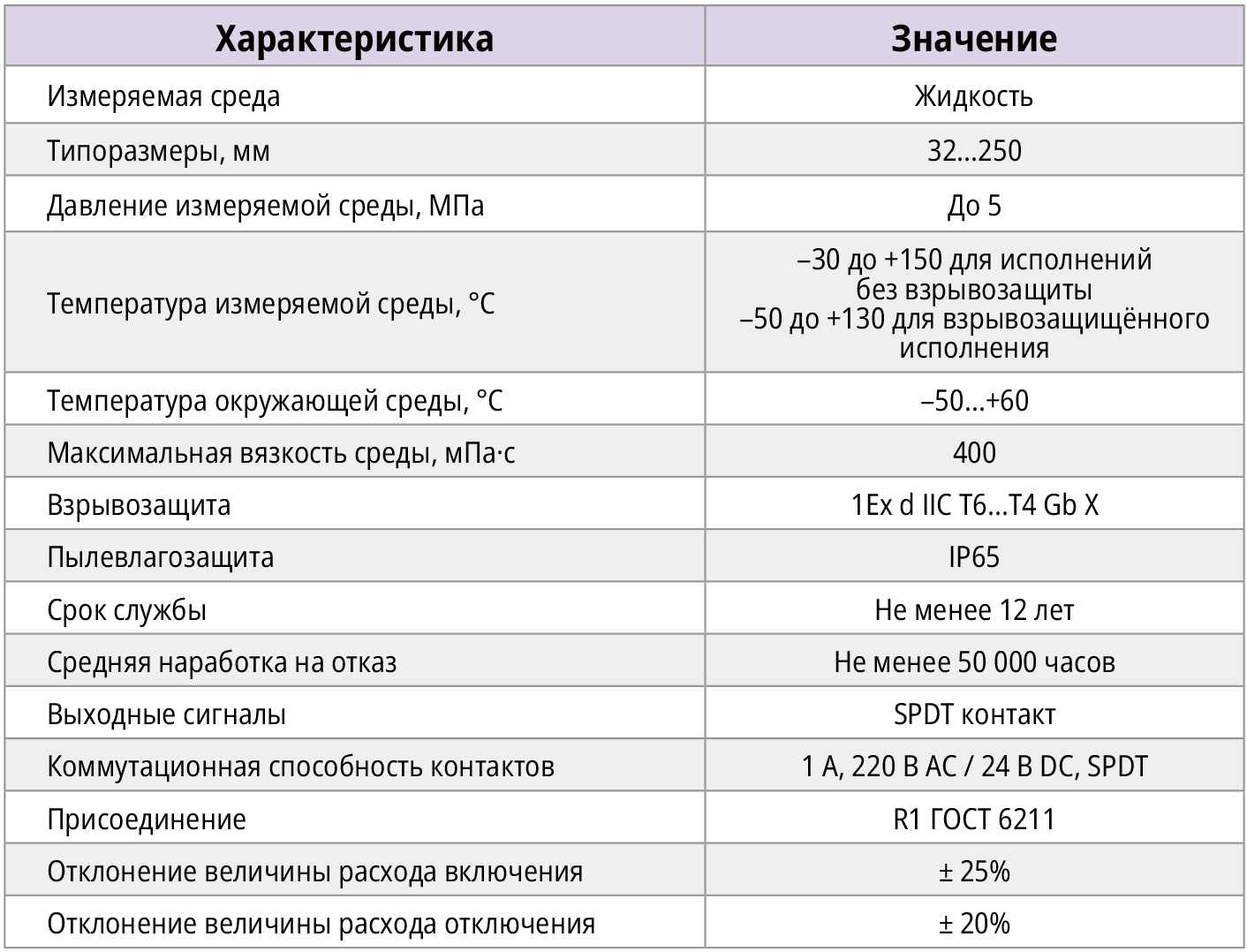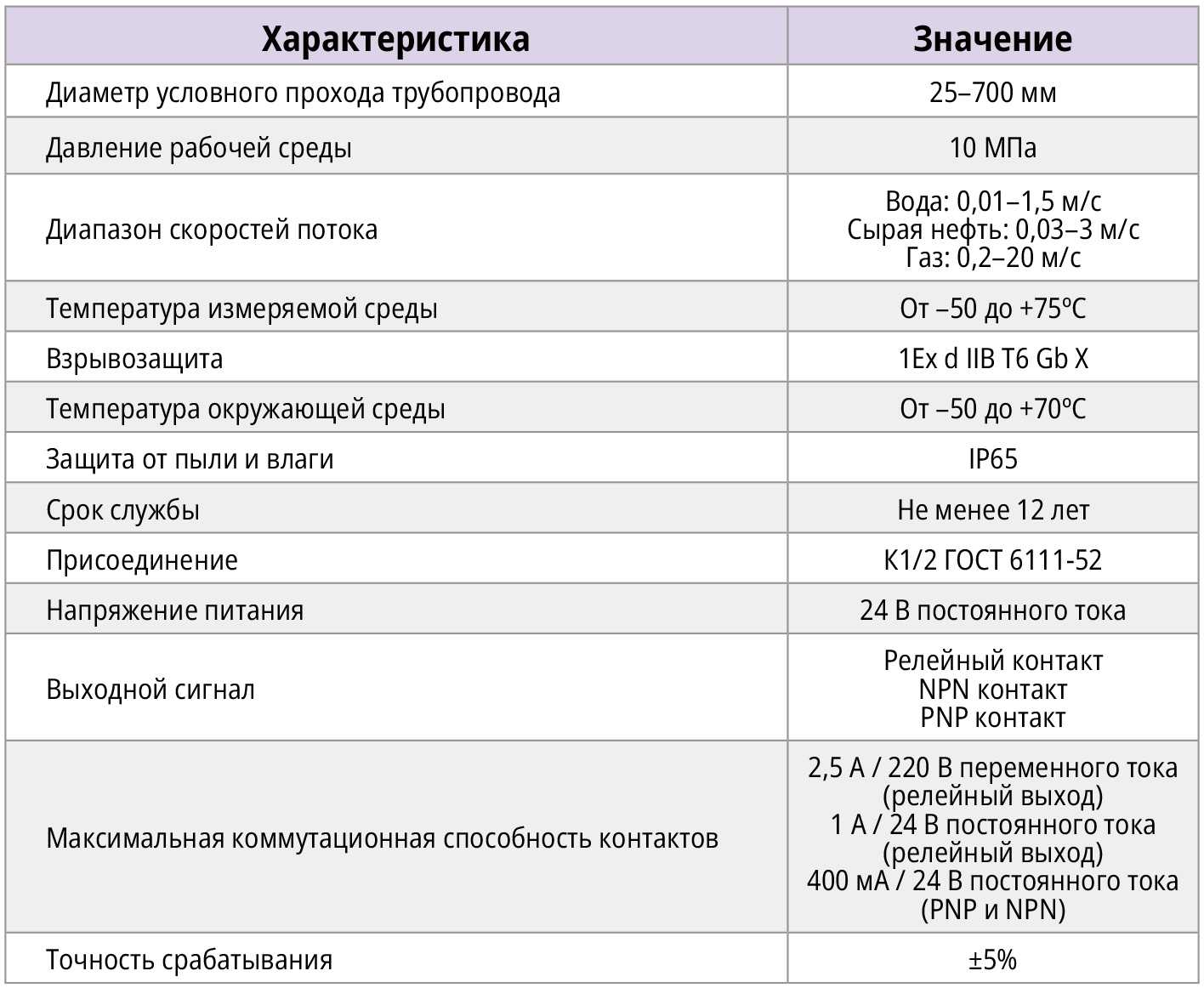 Технические характеристики термоанемометрического реле «Поток-285» представлены в табл. 1.