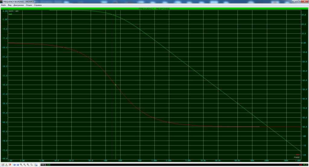 Обратите внимание, что на частоте среза сдвиг фаз между входным и выходным сигналом составляет 45 градусов или в радианах п/4 (кликните для увеличения)