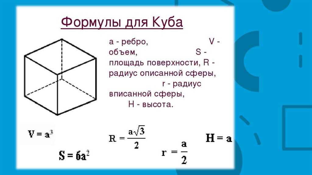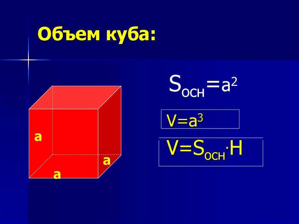 А объем куба — это занимаемое им пространство. Объем формулы куба будет рассчитан как: