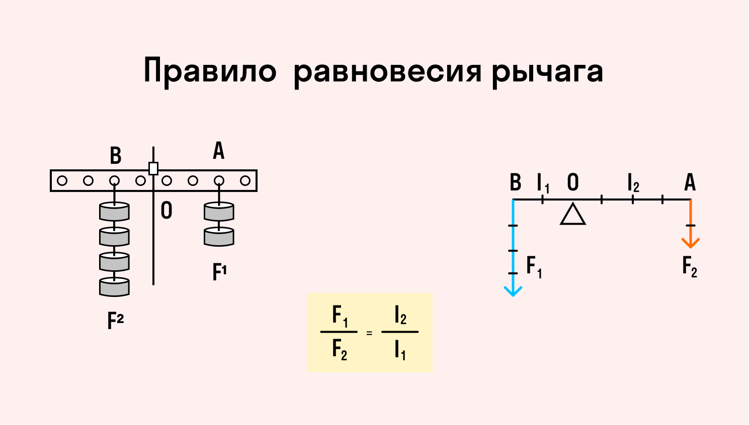 Рычаг находится в равновесии, если произведение силы на плечо с одной его стороны равно произведению силы на плечо с другой стороны.