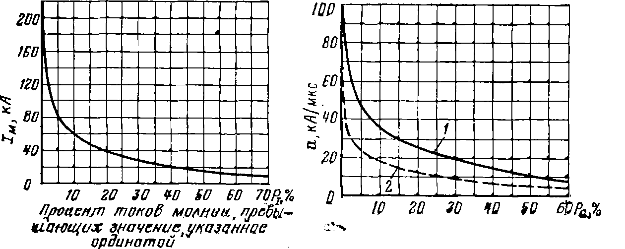 Рис. 19. Кривые вероятностного распределения (в процентах) крутизн фронта импульса тока молнии: 1 — для равнинных районов; 2 — для горных районов