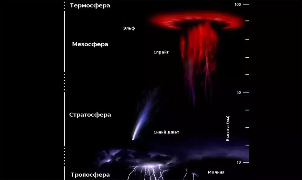Высота образования традиционных молний не превышает 16 км. Но молнии появляются и выше в атмосфере. Обнаруженные в 1989 г. на высоте около 100 км конусообразные вспышки с диаметром основания до 400 км ученые назвали эльфами. А спустя шесть лет, в 1995 г., был зафиксирован и описан еще один вид молний — джеты. Эта более живучая разновидность молний представляет собой синие трубчатые конусы высотой около 50 км.
