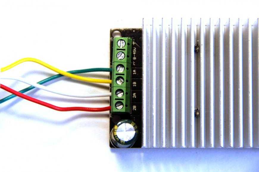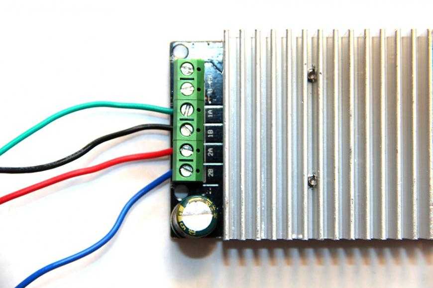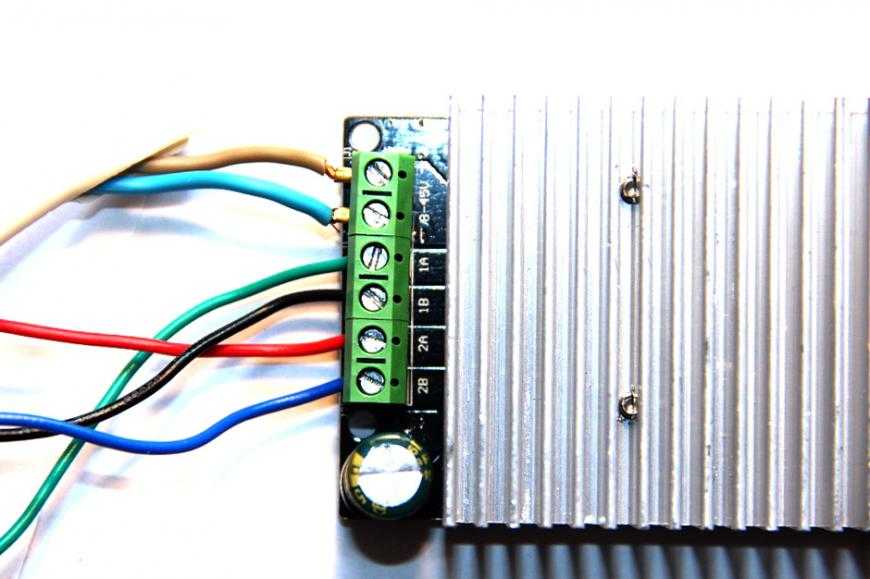 3) Подключаем шаговый двигатель NEMA 23 57HM56-2006 к драйверу ШД TB6600. Зеленый провод в разъём 1A, желтый в разъём 1B, белый в разъём 2A, красный в разъём 2B. Черный и синий провода лучше заизолировать, не ну если Вам нравится прыгать с бубном то не делайте этого.
