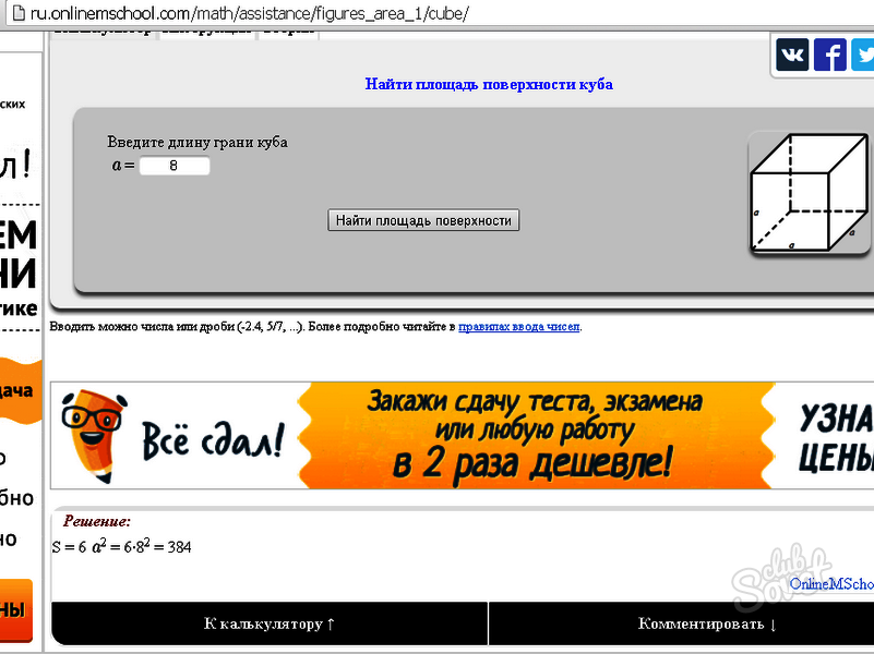 Для проверки правильности решения задачи «найдите площадь куба, если известна сторона» — воспользуйтесь онлайн калькулятором «подсчета площади куба» — см. ниже: