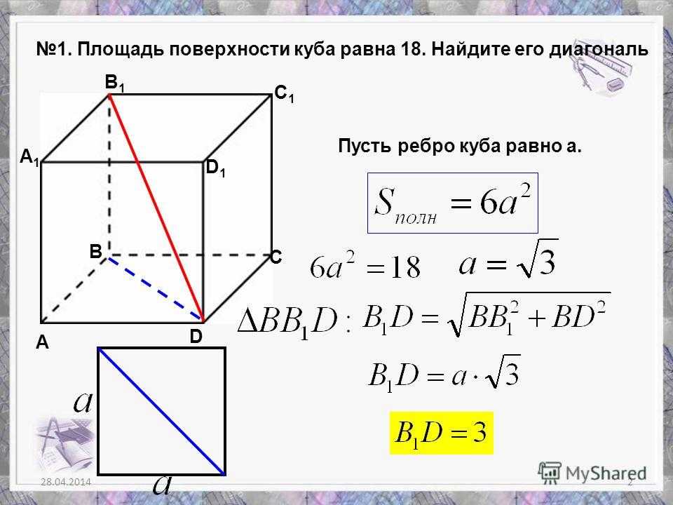 2. Если вычисляете по диагонали, не забудьте правильно перевести ее в длину ребра.
