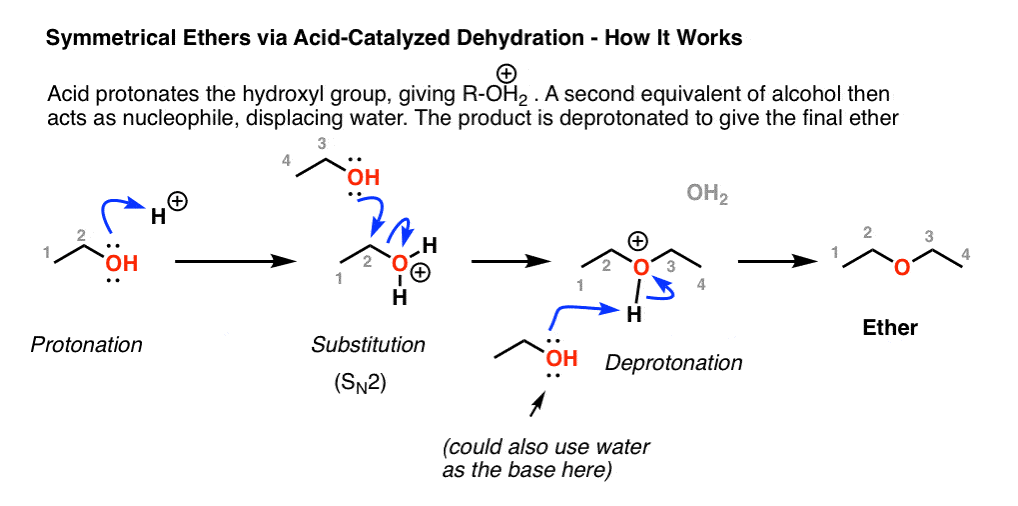 На первом этапе механизма реакции один спирт протонируется, чтобы стать хорошей уходящей группой. На второй стадии второй спирт вытесняет воду из протонированного спирта во время реакции \(SN_2\) с получением протонированного эфира. На заключительном этапе этот промежуточный продукт депротонируется с получением симметричного эфира.