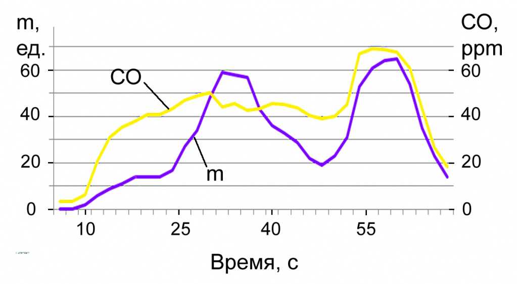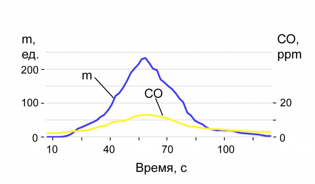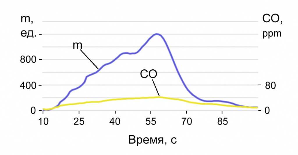 По сравнению с тлением фитиля в коробке концентрация СО увеличилась примерно в 1,5 раза, что может быть объяснено более интенсивным тлением хлопка. Уровень оптической плотности упал более чем на порядок. При тлении фитиля в коробке уровни порядка 60–65 ед. набегают через несколько секунд. Определенно наблюдается резкое падение чувствительности оптико-электронного измерителя инфракрасного диапазона с длиной волны порядка 950 нм (0,95 мкм) по дымам с размерами частиц менее 1 мкм.