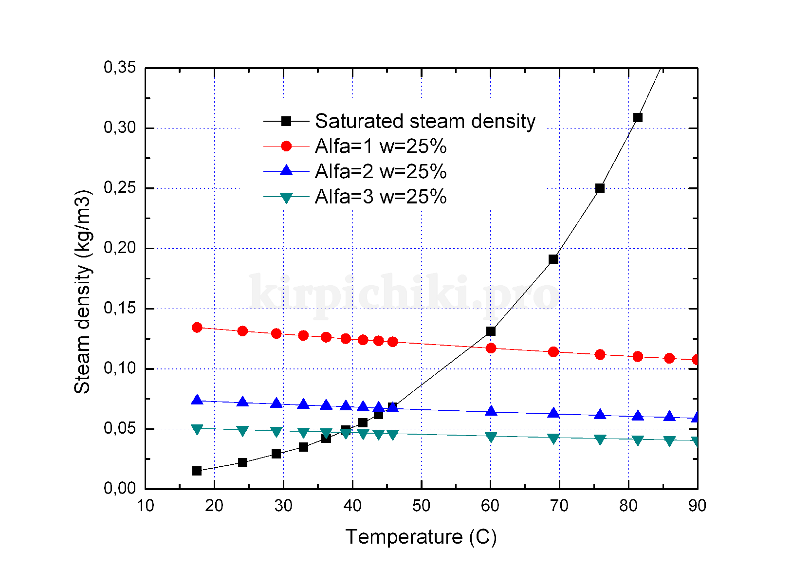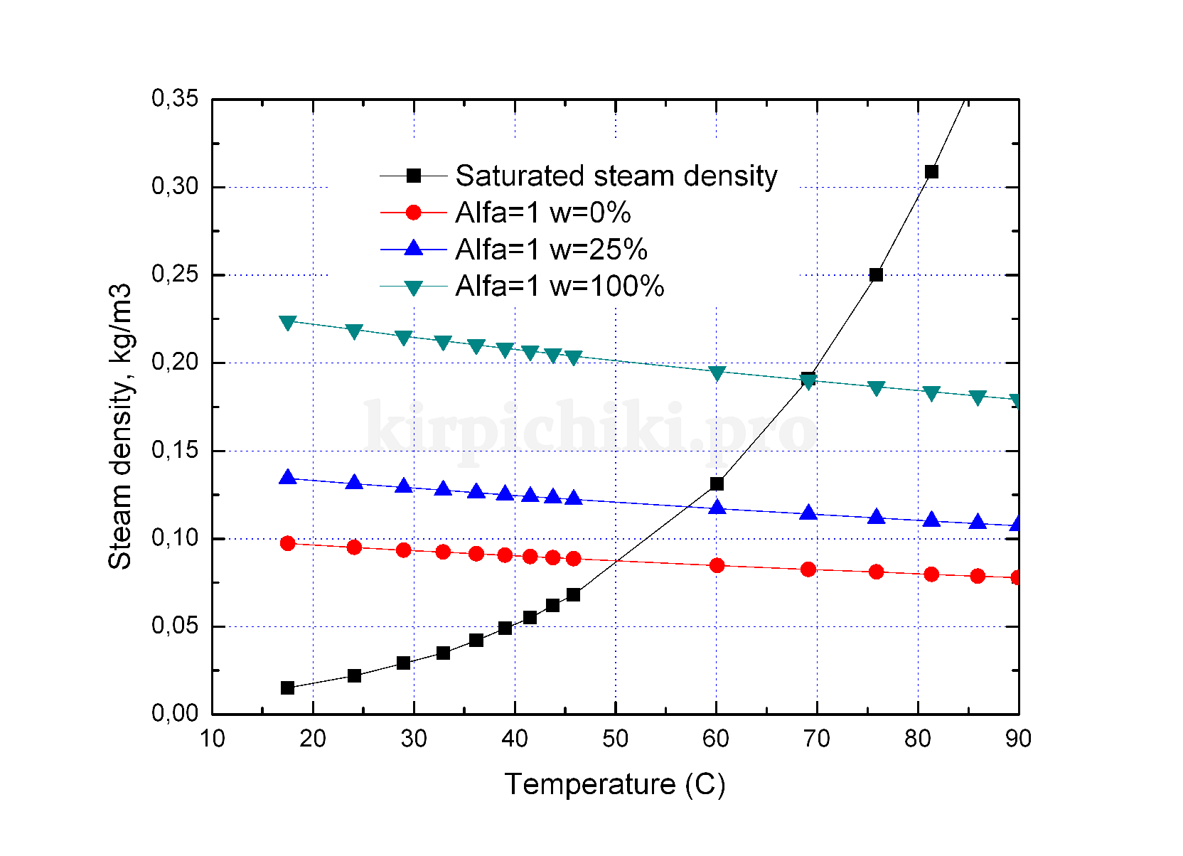 Все вышеприведенные рассуждения справедливы в случае, если состав топлива остается неизменным по времени, например в толивнике сжигается газ или подаются непрерывно пеллеты. В случае горения закладки дров в печи периодического действия состав дымовых газов меняется со временем. Сначала выгорают летучие и испаряется влага, а затем сгорает угольный остаток. Очевидно, что в начальный период содержание водяных паров в ДГ будет значительно выше чем рассчитанное, а на этапе горения угольного остатка — ниже. Попробуем примерно оценить температуру точки росы в начальный период. Пусть летучие выгорают из закладки в первую треть процесса протопки, также и вся влага, содержащаяся в закладке испаряется за это время. Тогда концентрация водяных паров в первой трети процесса будет в три раза выше средней. При 25% влажности древесины и 2х-кратном избытке воздуха плотность пара составит 0,075 * 3 = 0,225 кг/м3. (см РИС, синий график). Температура конденсации при этом будет 70-75*С. Это примерная оценка, т. к. неизвестно, как же в реальности изменяется состав ДГ по мере прогорания закладки. Кроме того, из дымовых газов вместе с водой конденсируются недогоревшие летучие, что, видимо, несколько повысит точку росы ДГ.