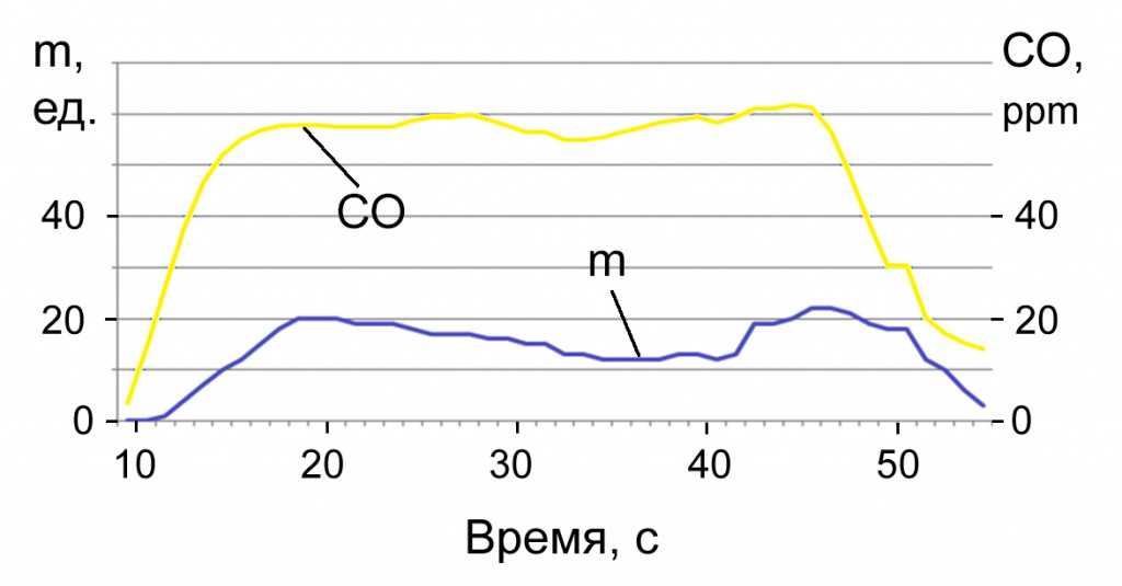На рисунке 14 приведен график изменения удельной оптической плотности и концентрации СО при тлении хлопкового фитиля на входе трубки диаметром Ø10 мм. Концентрация СО в этом случае остается примерно такой же, как при тлении фитиля в трубке, примерно на уровне 60 ppm, а измеренная величина оптической плотности падает еще в 3 раза, до уровня 20–22 ед.