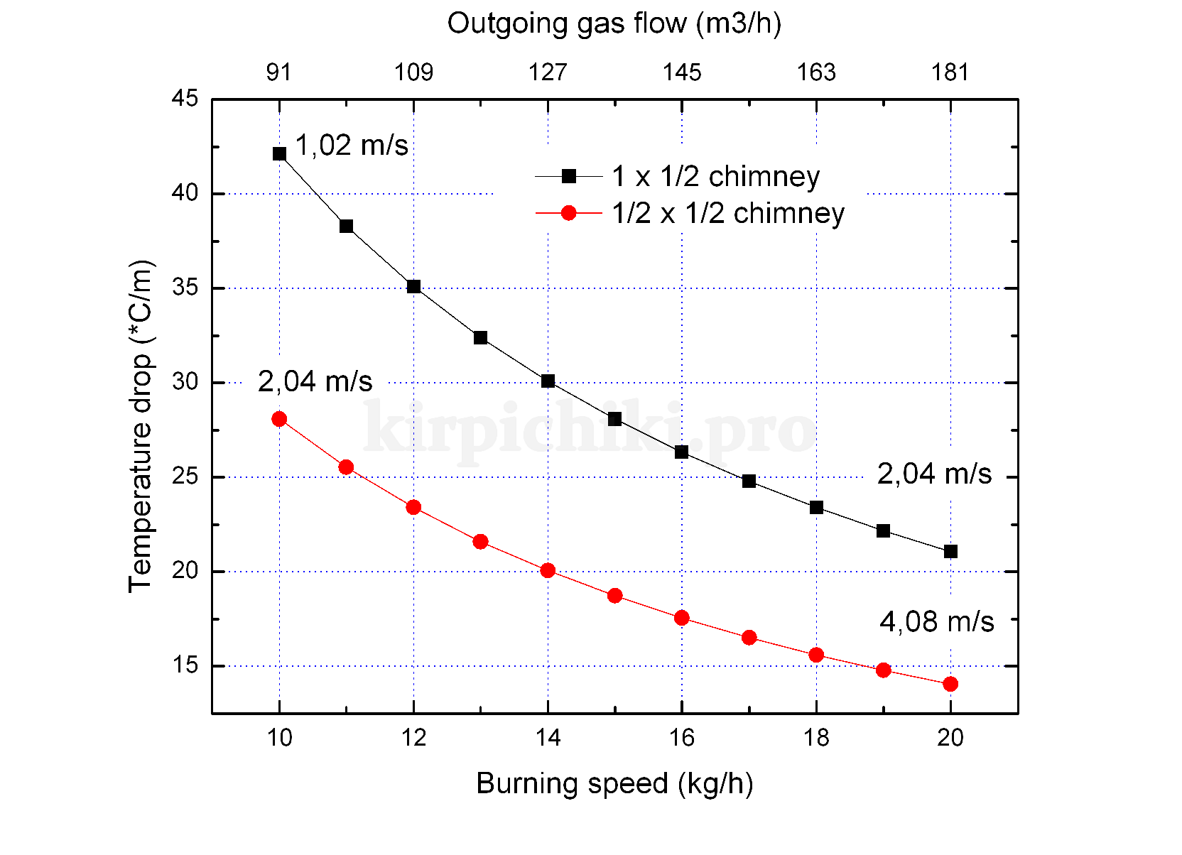 Зная скорость горения дров в печи и сечение дымохода можно оценить снижение температуры в дымоходе в расчете на погонный метр по формуле: