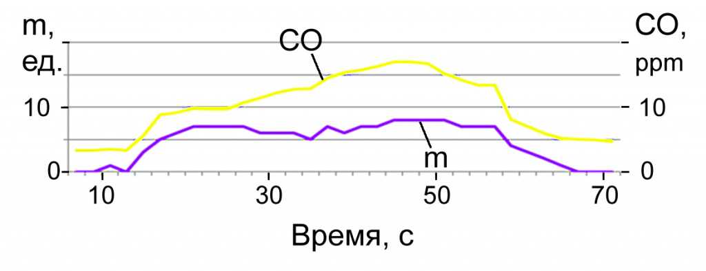 Первые признаки появления оптической составляющей дыма, на уровне 3–5 ед., наблюдаются примерно через 12 с, появление концентрации СО с превышением фона примерно в 1,5 раза – через 14 с от начала теста. Тление фитиля продолжалось 51 секунду, что точно совпадает с продолжительностью нарастания концентрации дыма (рис. 11). Максимальные показания измерителя оптической плотности среды 1202 ед., максимальная концентрация СО равна 41,7 ppm.