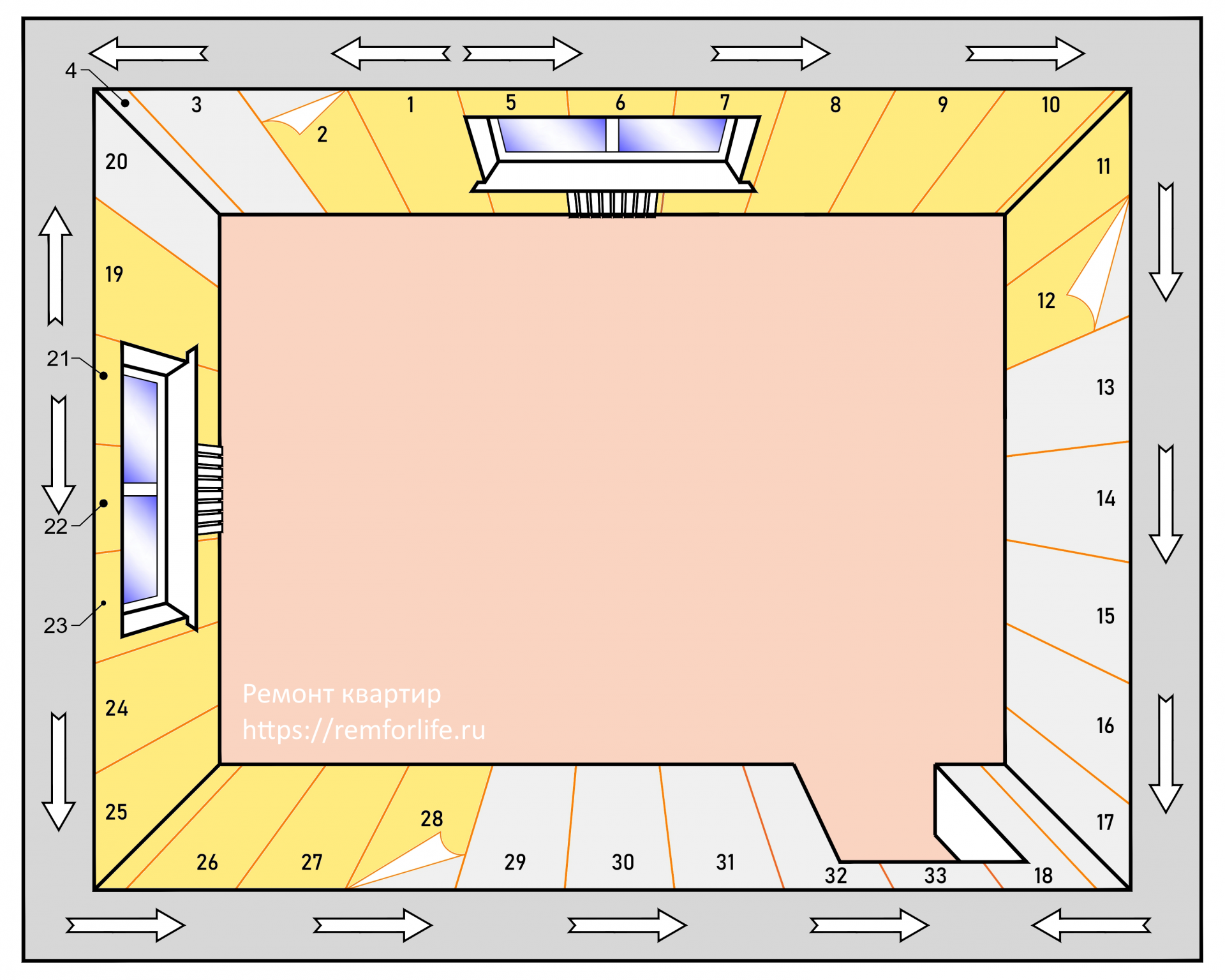 Схема поклейки обоев от окон (вариант с двумя окнами в комнате)