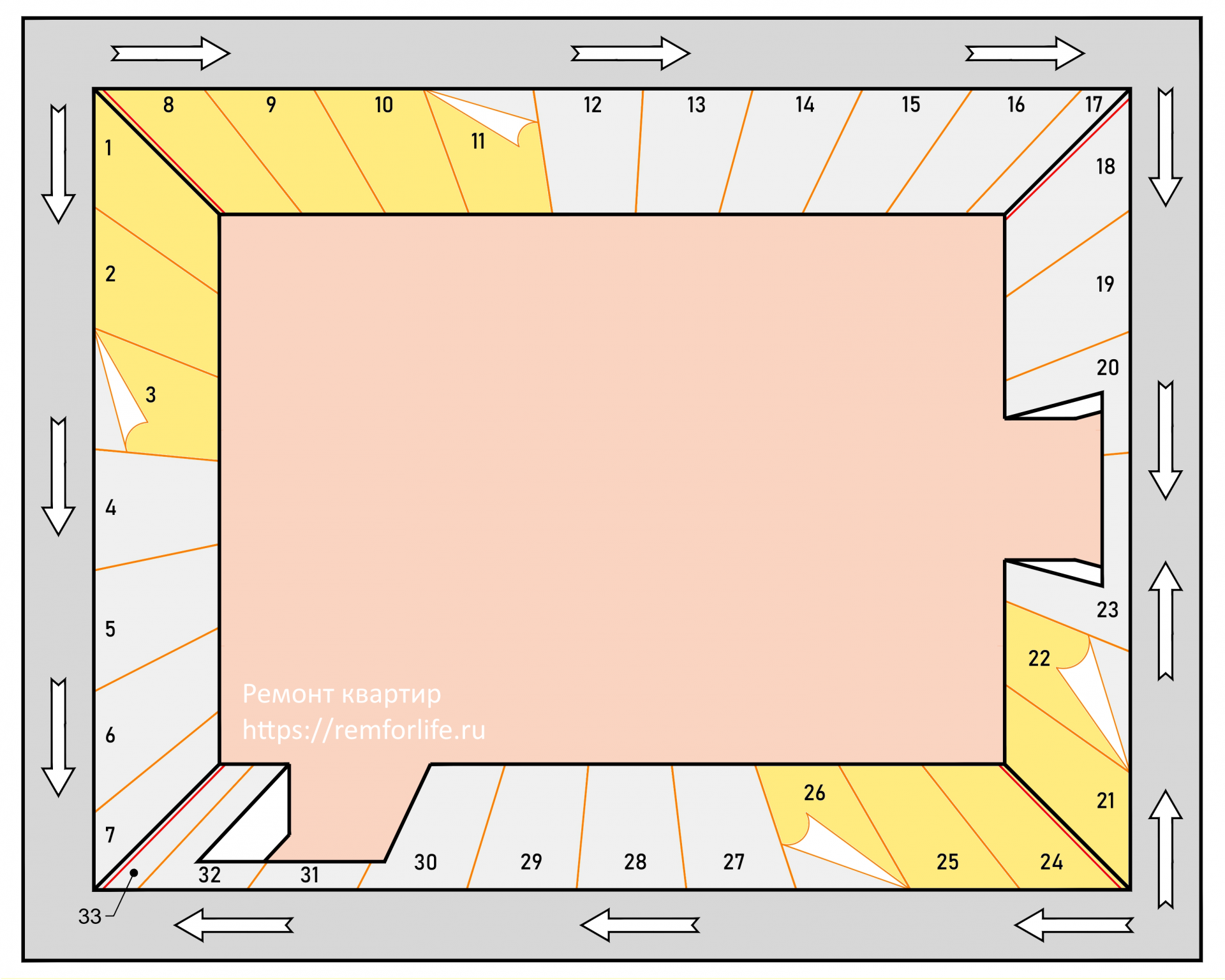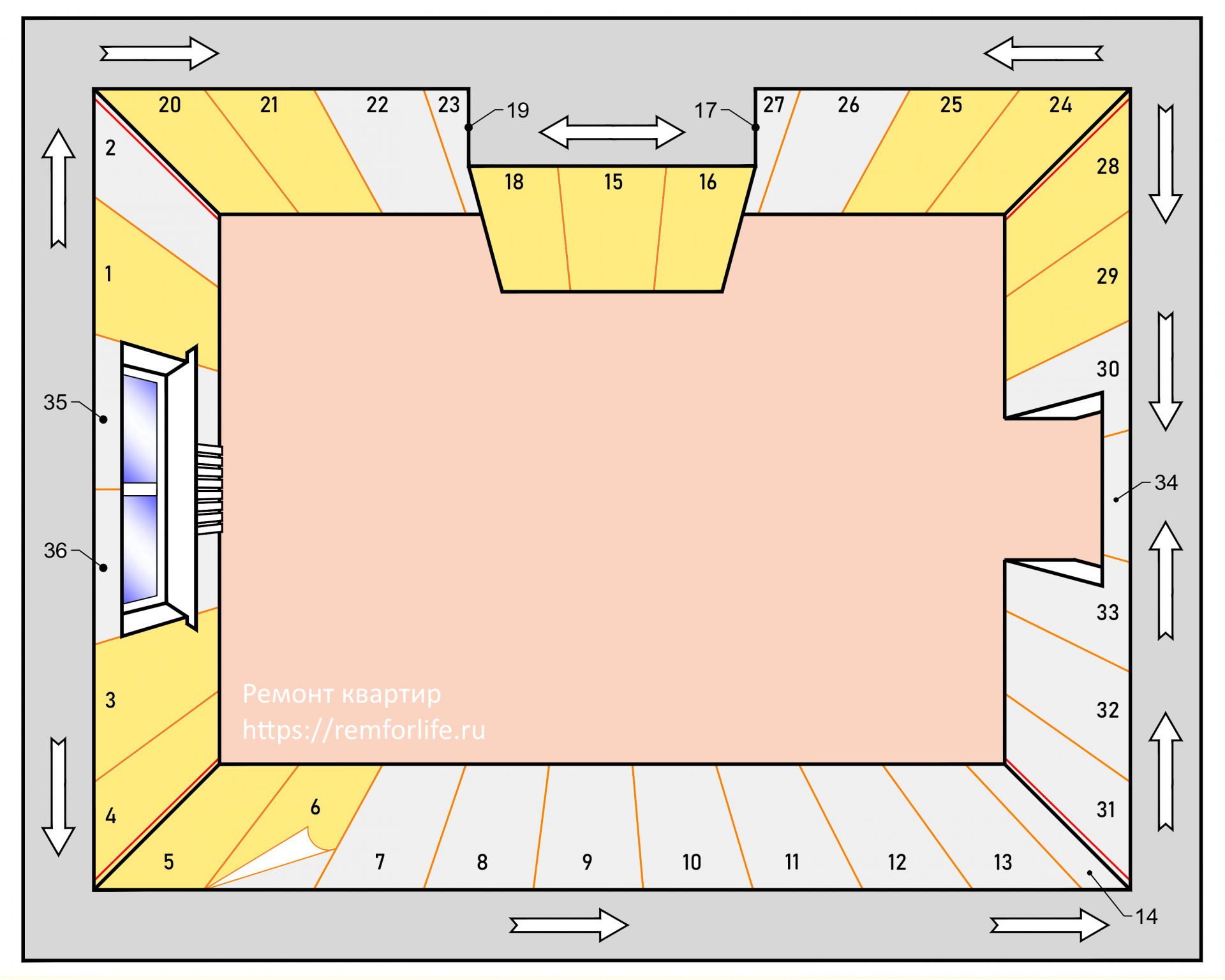 Схема поклейки обоев от окна и эркера