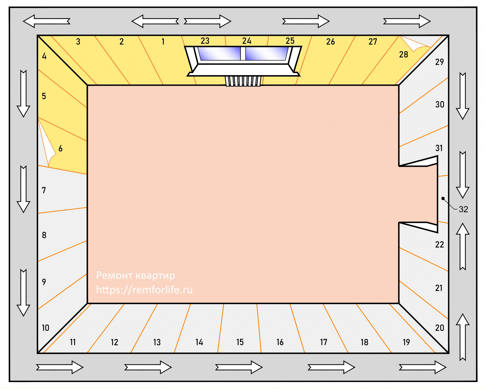 Схема поклейки обоев от окна (вариант 1, с одним окном в комнате)