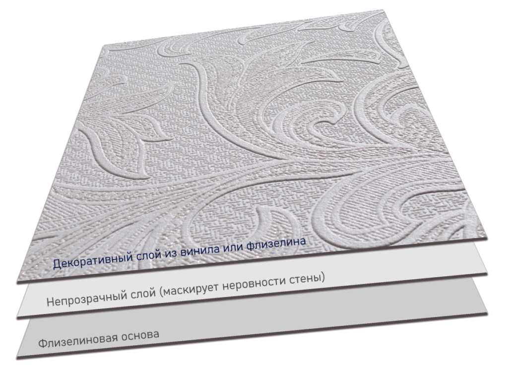 Обои получают на производстве путем спаивания нескольких его слоёв между собой, получая плотное и цельное полотно. При этом, есть различия в структуре слоев: внутренние – ровные и гладкие, а верхний обладает рельефом или рисунком.