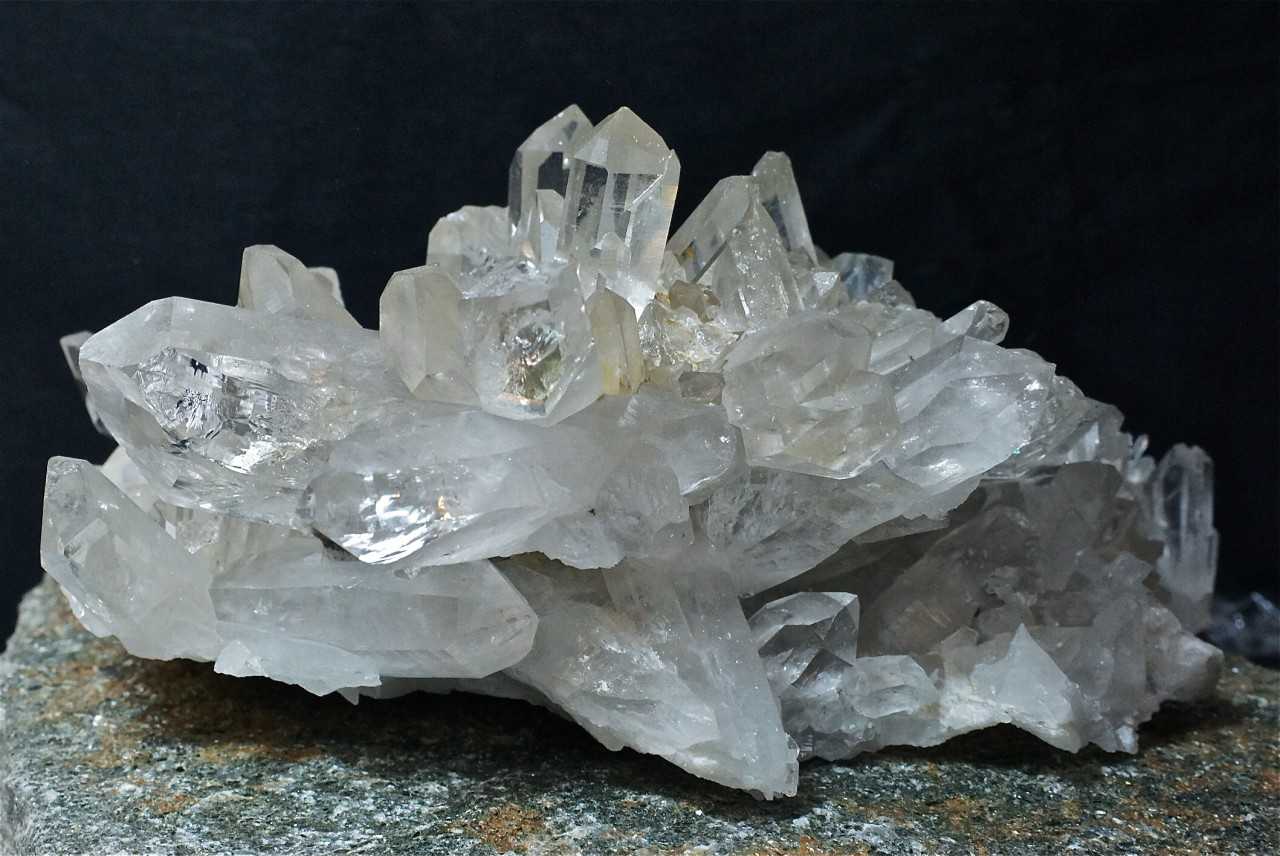 Горный хрусталь. Фото друзы прозрачного бесцветного кварца. Химическая и физическая устойчивость кварца обусловила применение крупных блоков кварца, вырезанных из кристаллов горного хрусталя, в качестве национальных стандартов меры массы.