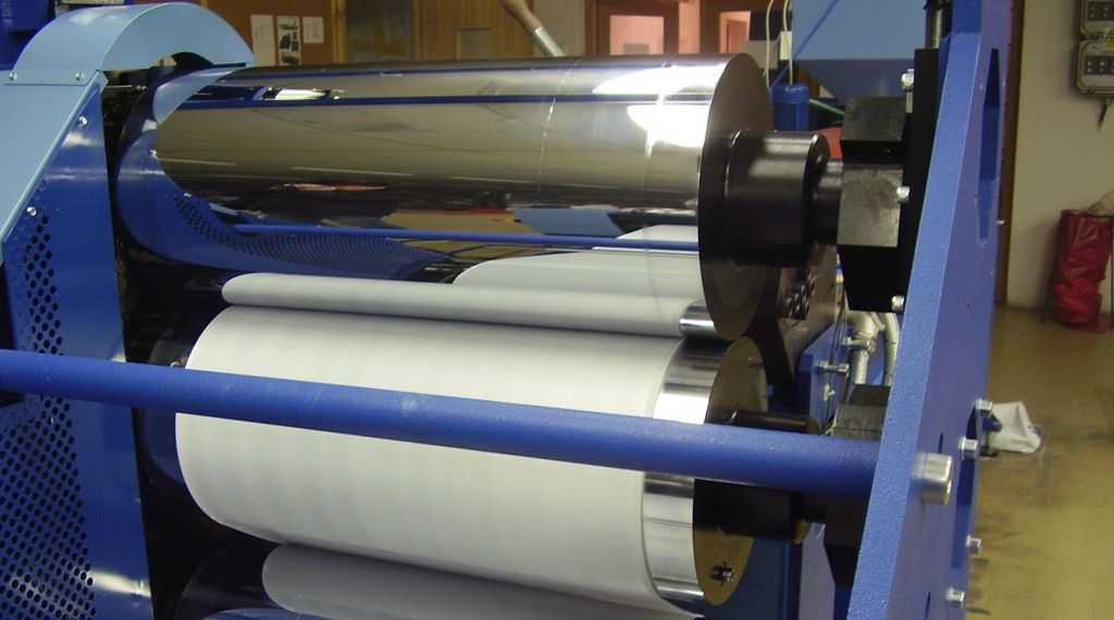 Метод каландрования используется значительно реже экструзии. Он менее производителен, но способен дать полимерную пленку с более точными размерными характеристиками, а также нанести нужную текстуру. Основным видом используемого оборудования является каландр, состоящий из 3-6 термостатируемых валов. Пленочное полотно формуется в зазорах между вращающимися валками каландра.