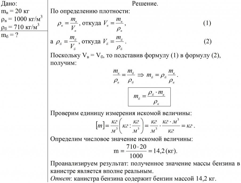 Для определения массы бензина в канистре нам необходимо найти плотность бензина и ёмкость канистры, которая равна объёму воды. Объём воды определим по её массе и плотности. Плотность воды и бензина найдём в таблице. Задачу лучше решать в единицах СИ.
