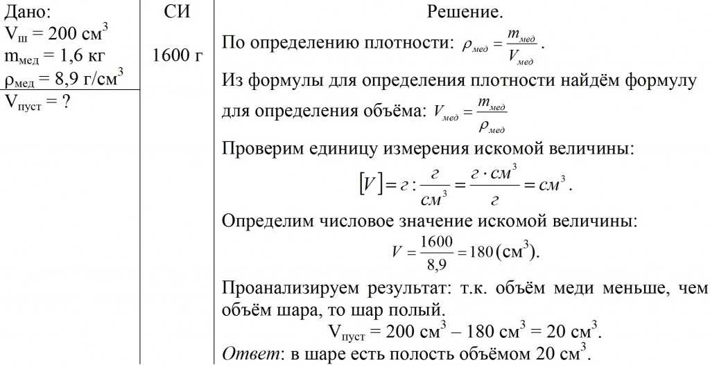 Медный шар объёмом 200 см 3 имеет массу 1,6 кг. Определите, цельный этот шар или пустой. Если шар пустой, то определите объём полости.