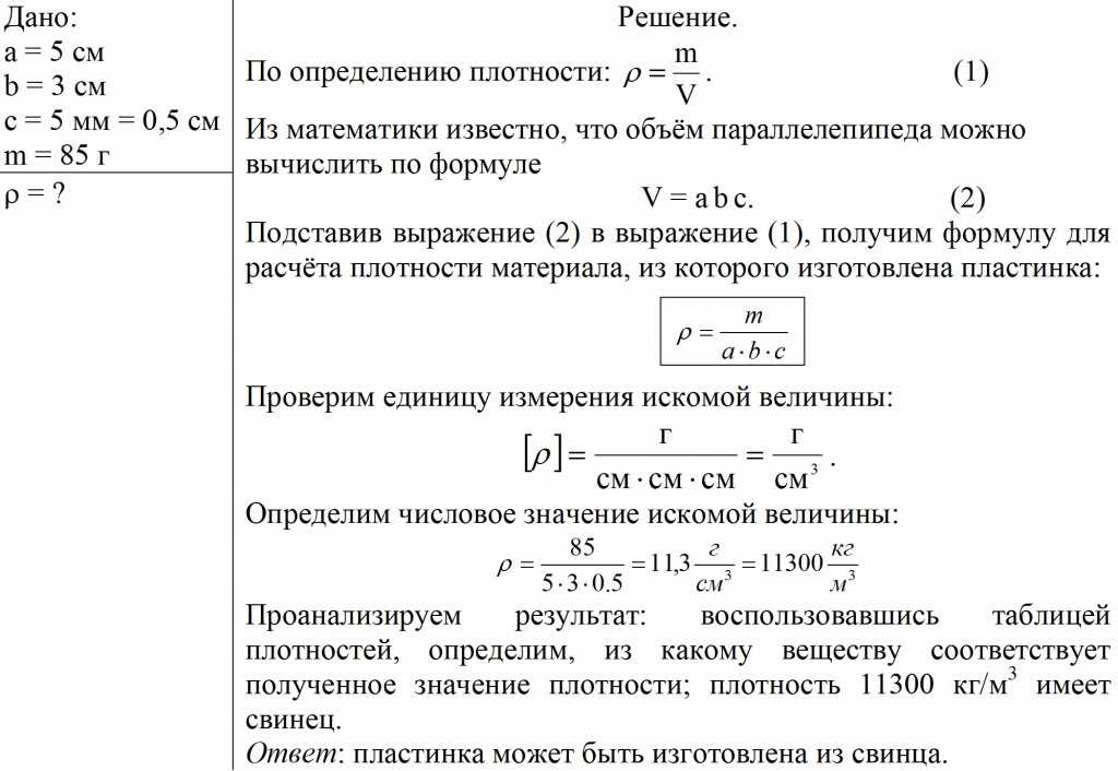 Именно на этом этапе закладывается алгоритм решения физической вычислительной задачи, идеология применения основных формул, определений, закономерностей. Научить анализу задачи, способу поиска неизвестного, особенностям использования единиц измерения учитель пытается на применении такого соотношения, как формула плотности в физике.