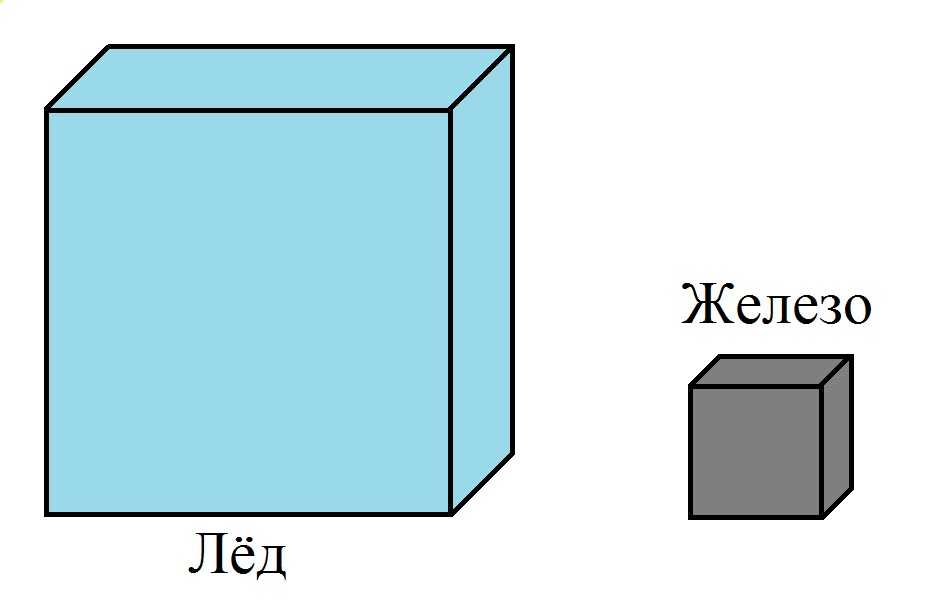их объёмы будут различны. Например, объём льда почти в 9 раз больше объёма железного бруса.