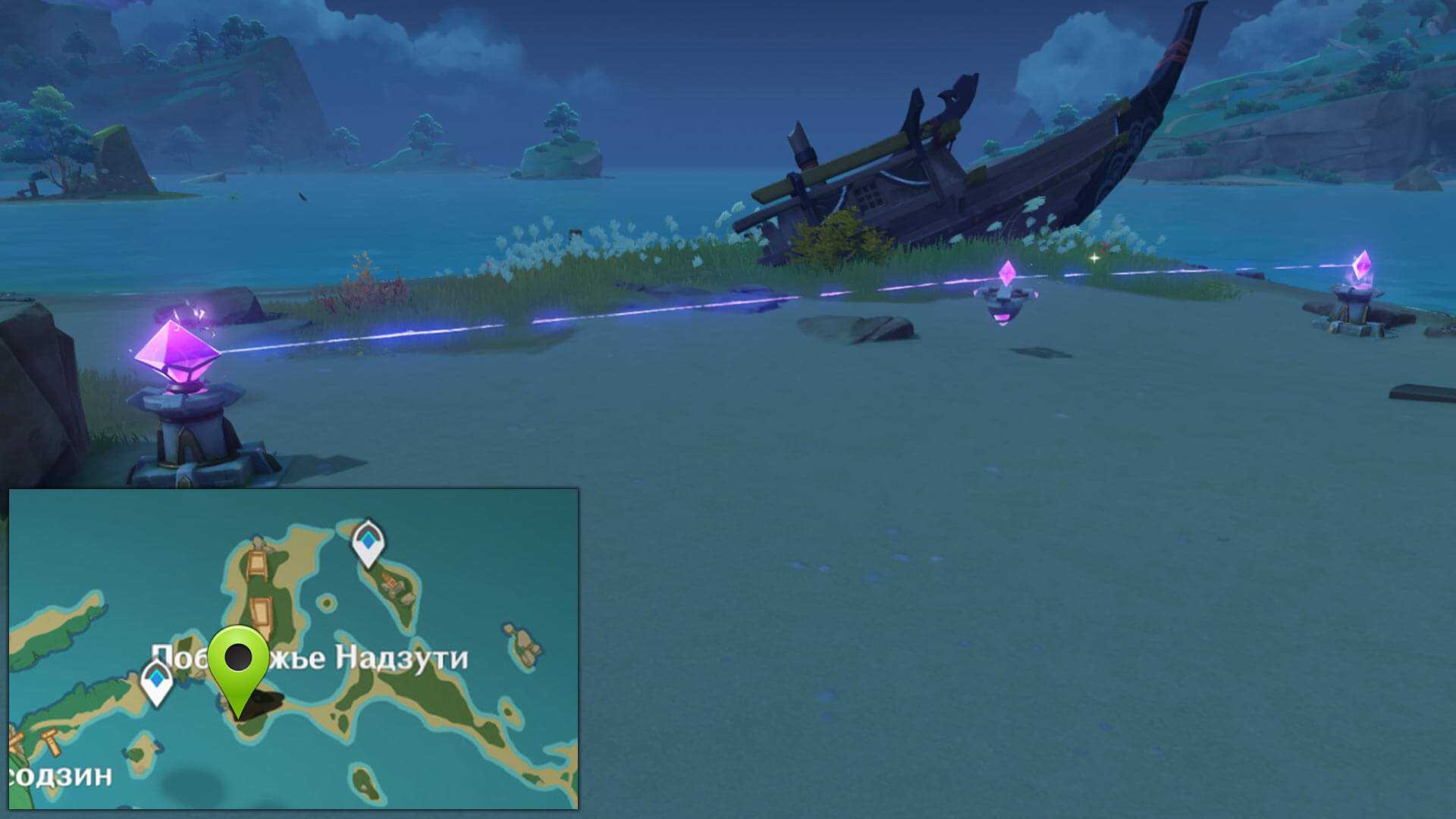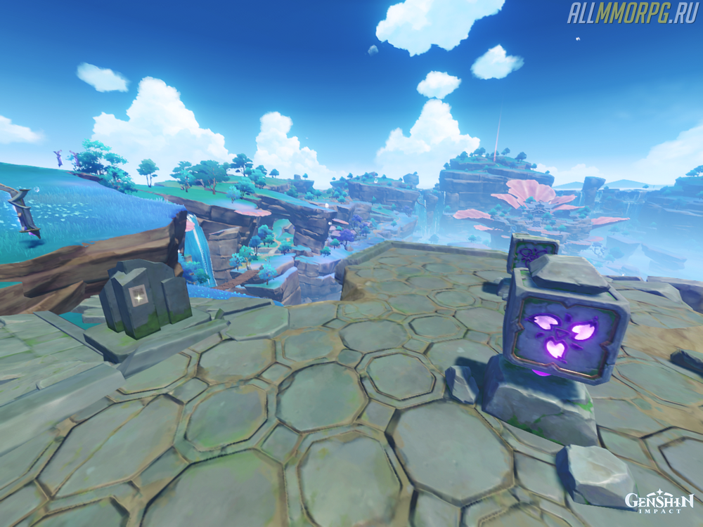 На юго-востоке от Татарасуны на небольшом островке можно найти два механических куба, между которыми стоит ветвь громовой сакуры. Если призвать электрогранум и воспользоваться громовыми сферами, то можно попасть на второй остров с еще двумя кубами. Вам нужно будет ударить их в определенном порядке, чтобы на них всех загорелись лепестки. На скриншотах ниже показана нужная последовательность. В отдельном руководстве мы подробнее рассказали про решение загадки.