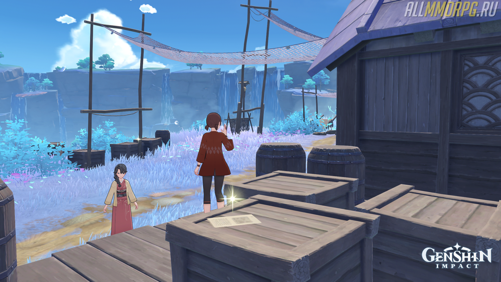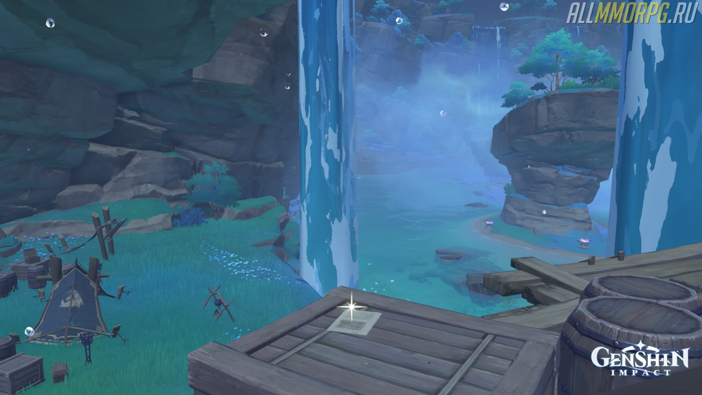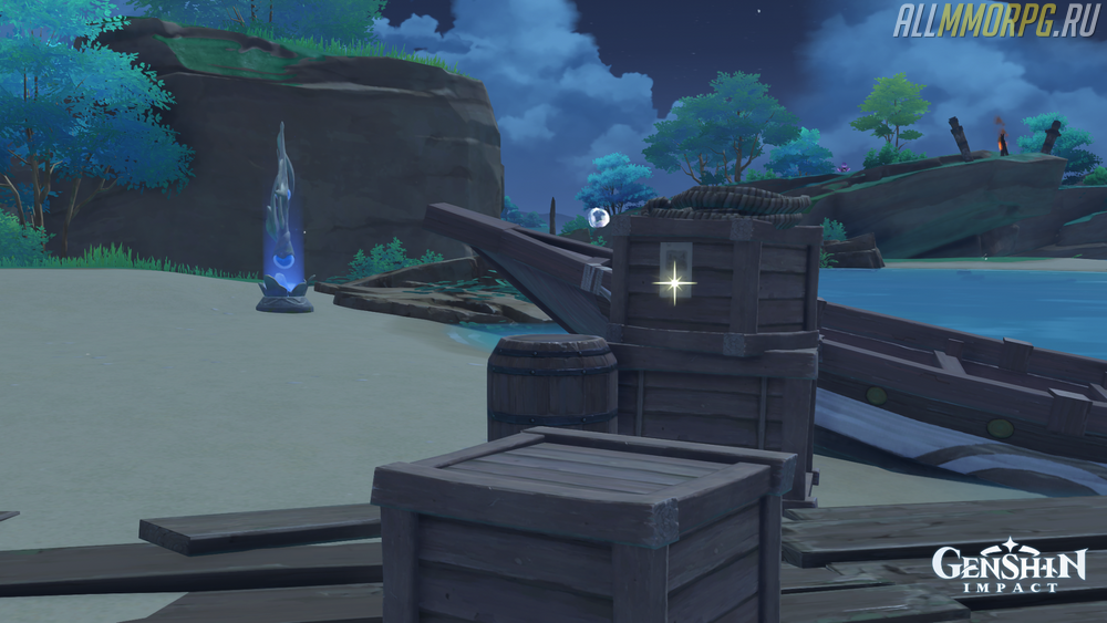 Две цепи: один камень рядом с хиличурлом, второй скрыт за ящиками. Награда Обычный сундук .