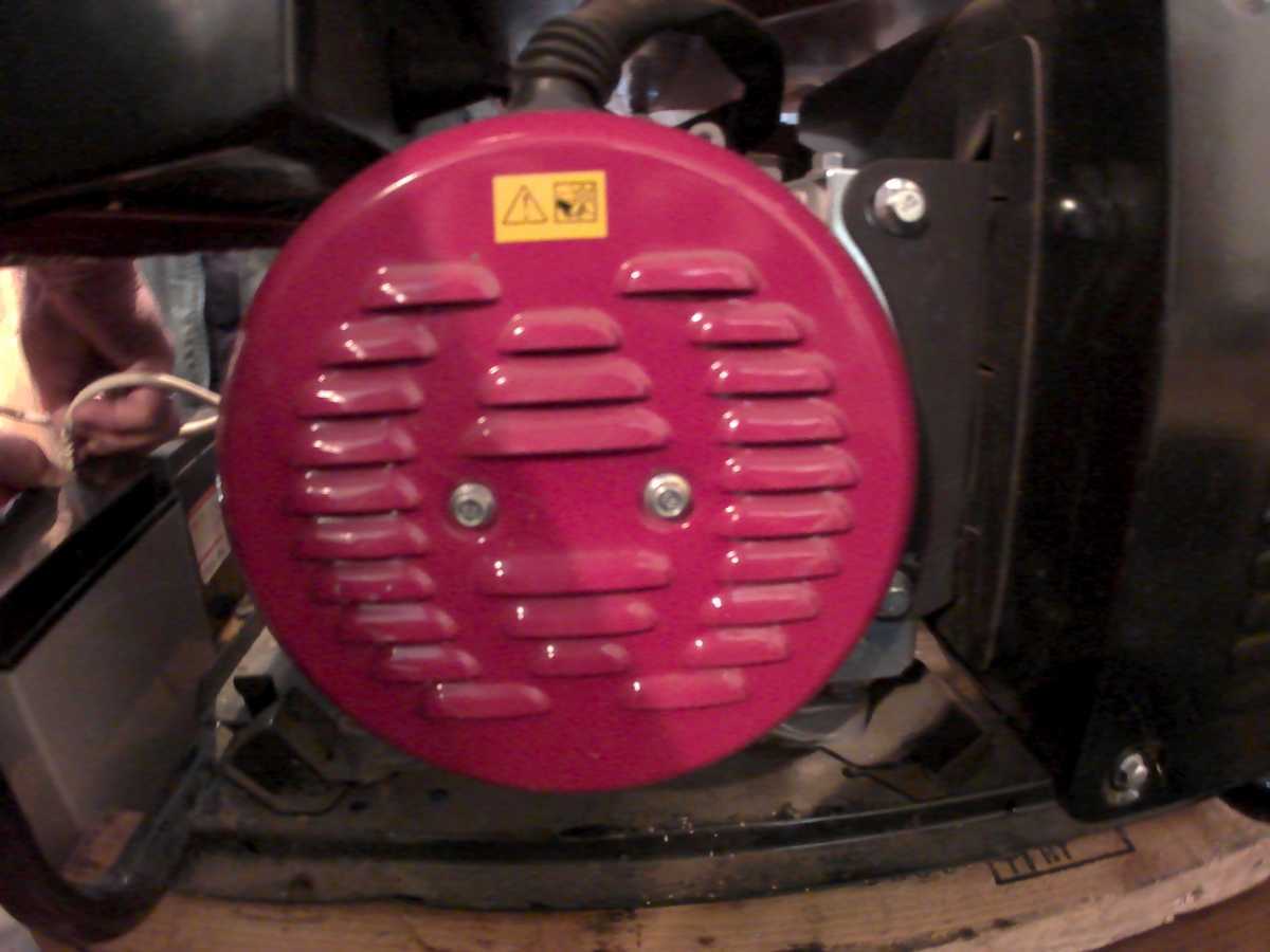 Исключив вышеописанные версии, идем дальше. С торцевой части генератора, в противоположной стороне от ручного стартера, расположен альтернатор (обмотки), он закрыт металлической крышкой, которая крепиться двумя болтами.