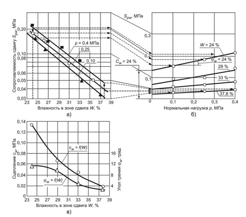 Суть опытов заключается в проведении серии испытаний с образцами, которые были выдержаны под разными нагрузками разное время и, соответственно, имеют различную плотность и влажность. Путем несложных построений и преобразований получают кривые зависимости трения и сцепления от влажности.