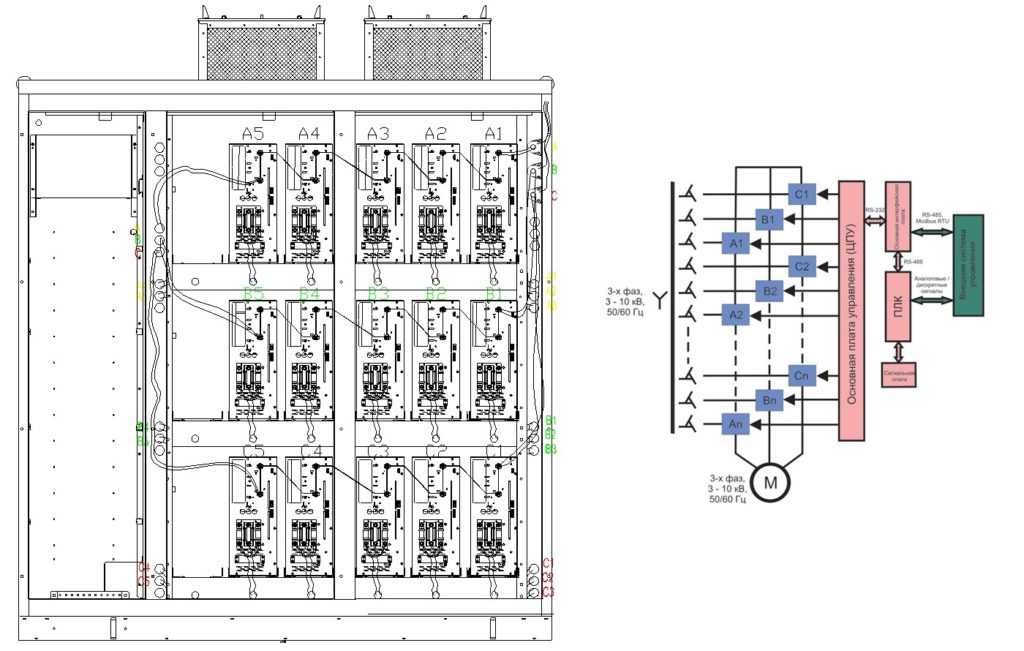 Высоковольтный преобразователь частоты размещают в электротехническом шкафу с тремя секциями: