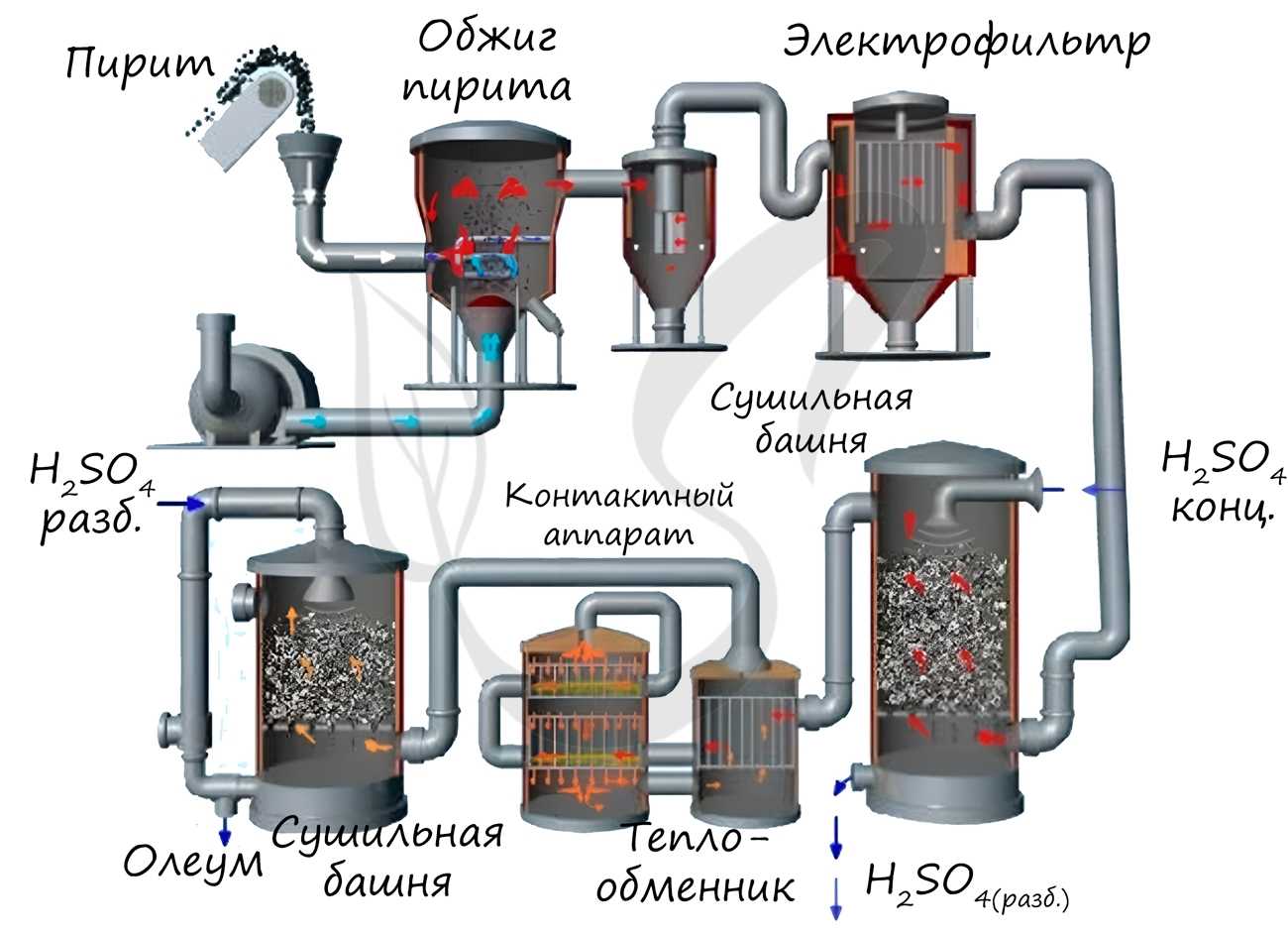 Известны несколько способов получения серной кислоты. Применяется промышленный (контактный) способ, основанный на сжигании пирита, окислении образовавшегося SO2 до SO3 и последующим взаимодействием с водой.